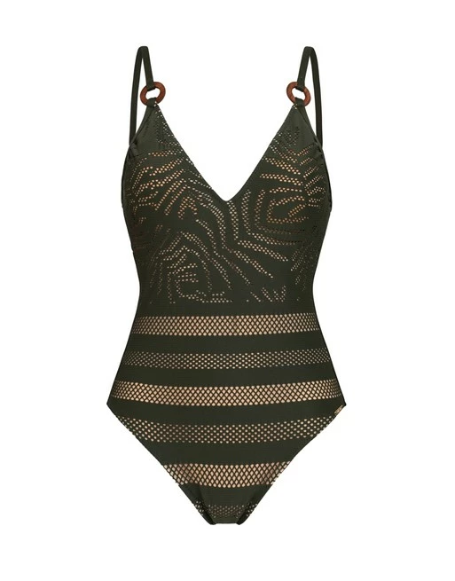 Dit Dolores Cortés badpak zonder beugel is uitgevoerd in een moderne kantbewerking op een beige onderlaag.