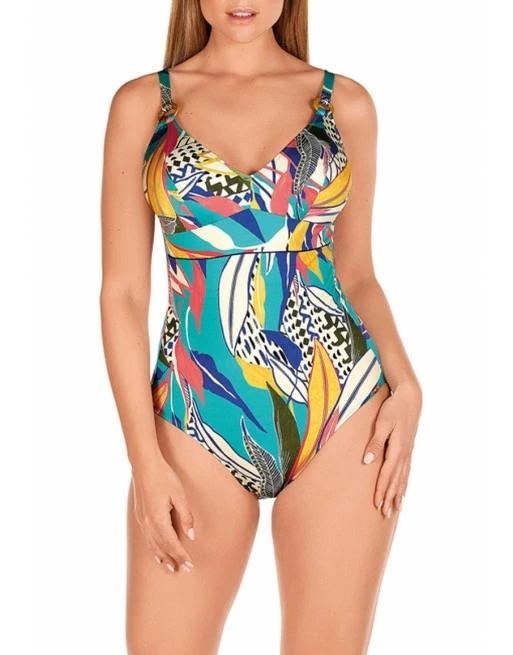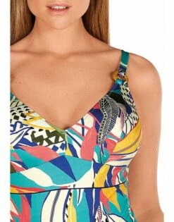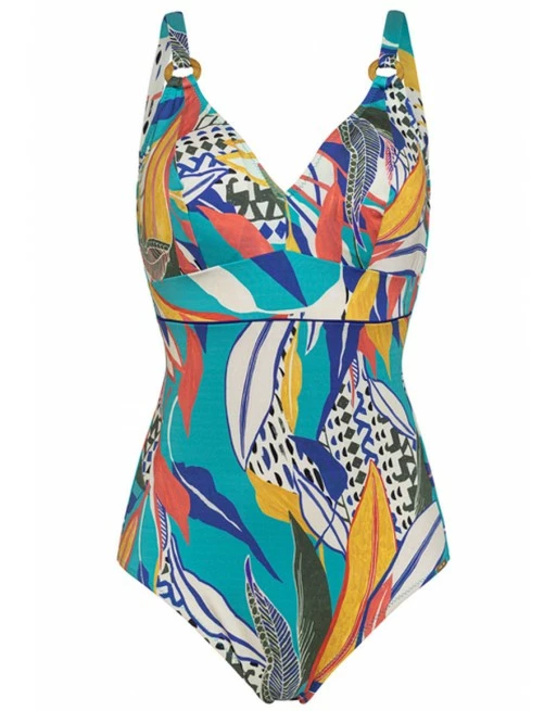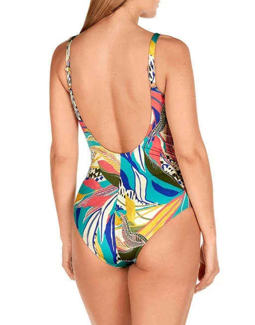Dit Dolores Cortés badpak zonder beugel is uitgevoerd in een elegant kleurenpalet van turquoise, geel, wit, koraal en kobaltblauw.