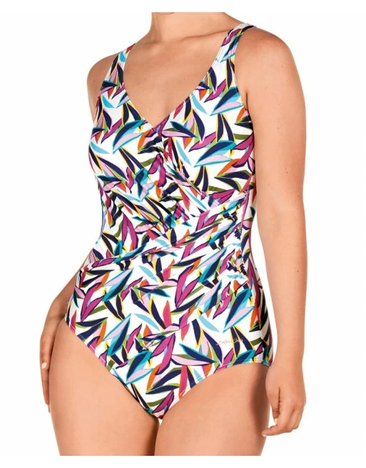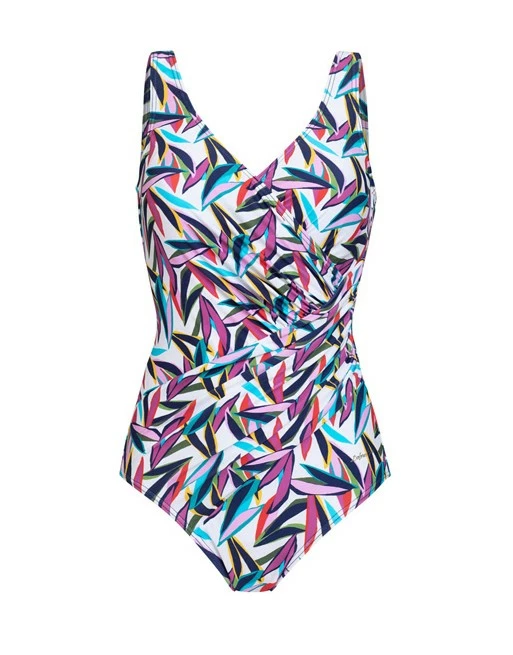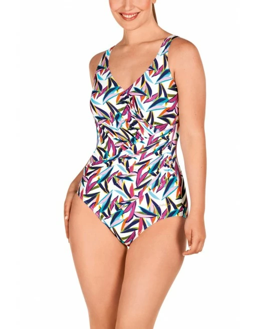 Dit Dolores Cortés badpak zonder beugel, uitgevoerd in een opvallende frisse geo-print.
