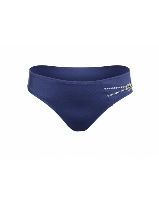 De Ulla Dessous Portofino bikini slip is uitgevoerd in maritieme stijl, witte bies op marineblauw en een gouden decoratief element.